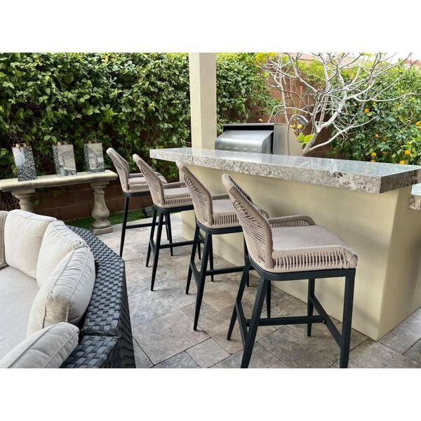 Modern Aluminum Twill Wicker Woven Bar Height Outdoor Bar Stool with Back and Dark Gray Cushion (2-Pack)