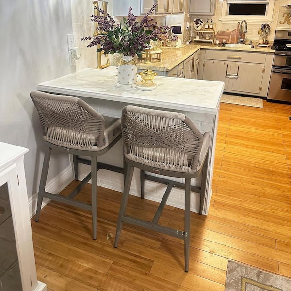 Modern Aluminum Twill Wicker Woven Bar Height Outdoor Bar Stool with Back and Light Gray Cushion (2-Pack)
