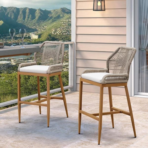 Modern Aluminum Twill Wicker Woven Bar Height Outdoor Bar Stool with Back and Sunbrella White Cushion (2-Pack)