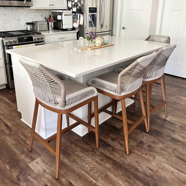 Modern Aluminum Twill Wicker Woven Counter Height Outdoor Bar Stool with Back and Beige Cushion (4-Pack)