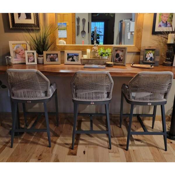 Modern Aluminum Twill Wicker Woven Counter Height Outdoor Bar Stool with Back and Dark Gray Cushion (2-Pack)