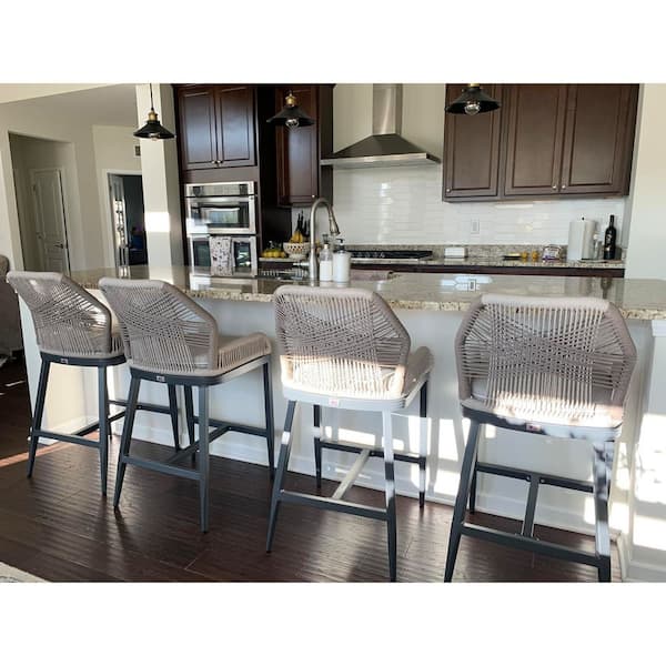 Modern Aluminum Twill Wicker Woven Counter Height Outdoor Bar Stool with Back and Dark Gray Cushion (4-Pack)