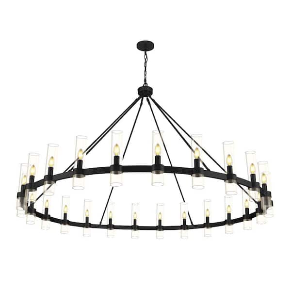 24 Lights 70 in. Dimmable Wagon Wheel Black Chandelier with Glass Shade for Living Room, Dining Room, Bedroom and Foyer