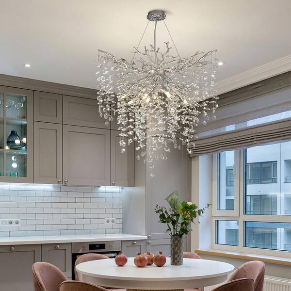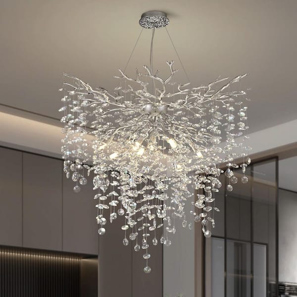 32 in. 10-Light Adjustable Chandelier with Crystal Decoration, Modern Silver Kitchen Island Chandelier, for Living Room