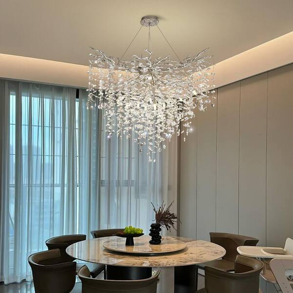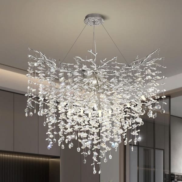 39 in. 12-Light Adjustable Chandelier with Crystal Decoration, Modern Silver Kitchen Island Chandelier, for Living Room