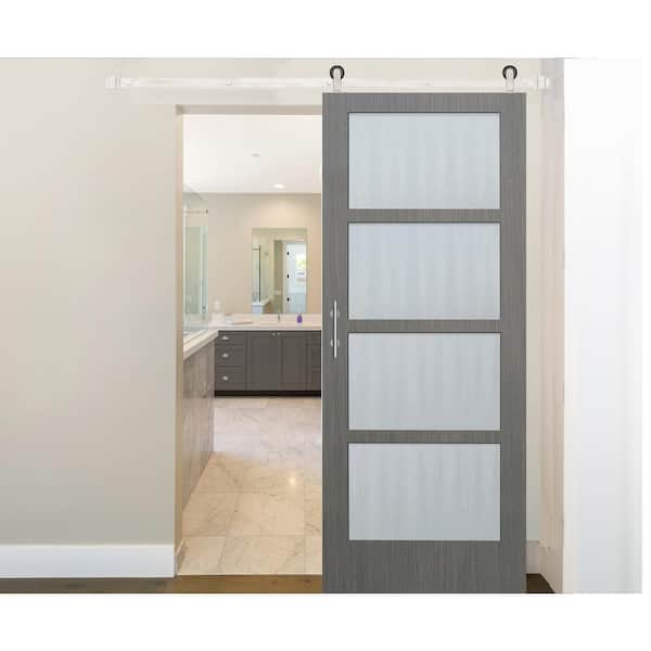 36 in. x 84 in. 4-Lite Driftwood Clear Coat Wood Interior Sliding Barn Door with Satin Nickel Hardware