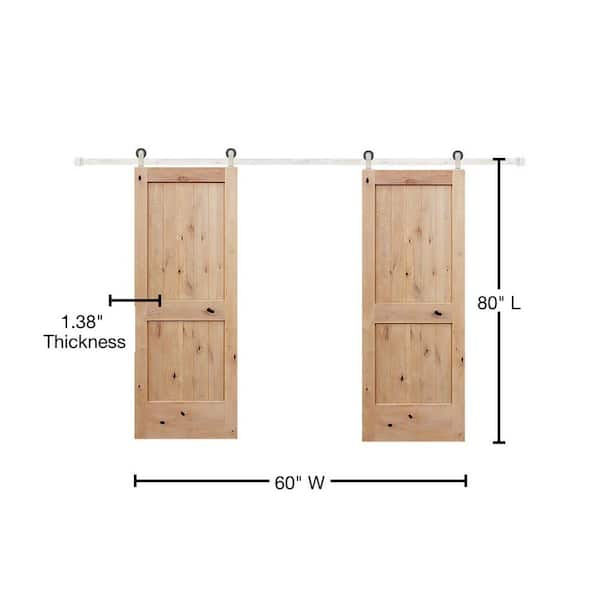 60 in. x 80 in. Biparting 2-Panel V-groove Solid Core Knotty Alder Sliding Barn Door W/Satin Nickel Hardware Kit