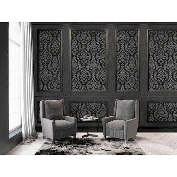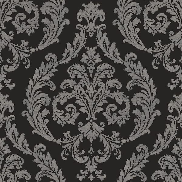 Palazzo 2 Collection Black/Silver Silk Damask Vinyl on Non-Woven Non-Pasted Wallpaper Sample