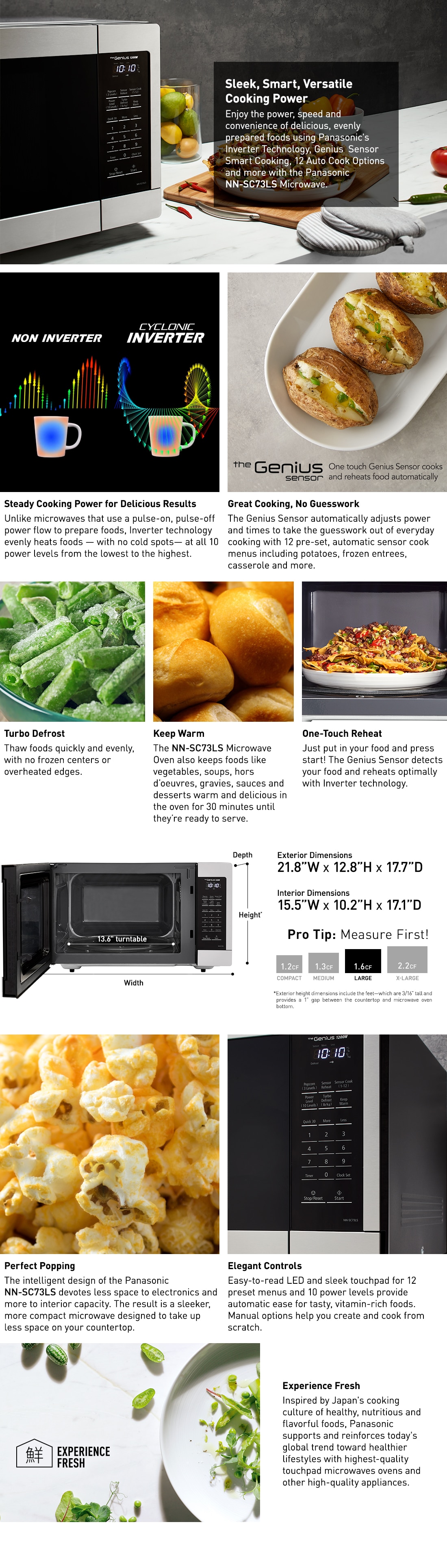The Panasonic NN-SC73LS microwave with Inverter Technology uses 1200-Watt of cooking power to cook, defrost, reheat and more. Unique Inverter Technology which, unlike traditional microwaves that rely on pulse-on, pulse-off power at lower temperatures, delivers a constant stream of cooking power at every temperature for more evenly cooked meals - edges to centers - every time. With the touch of the Genius Sensor cooking button, this microwave takes guesswork out of creating a great meal by automatically setting power levels and adjusting cooking or defrosting time for added time-saving convenience. The sensor measures the amount of steam produced during cooking and signals the microprocessor to calculate the remaining cooking time at the appropriate power level. A selection of 10-auto cook options enable you to quickly prepare your favorite foods, such as pizza, pasta, soup, casserole and other dishes, plus enjoy a dedicated popcorn button, keep warm function and more. Spacious 1.6 cu. ft. interior includes 13.6 in. glass turntable and fits a large baking dish. The stainless steel exterior design can rest on any open surface in the kitchen and can be easily moved.
