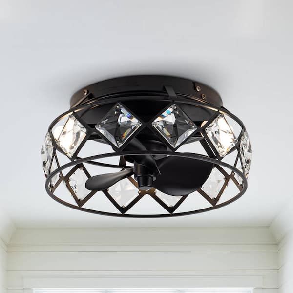 12.2 in. Indoor 3-Light Modern Black Caged Crystal Flush Mount Ceiling Fan with Light and Remote Control