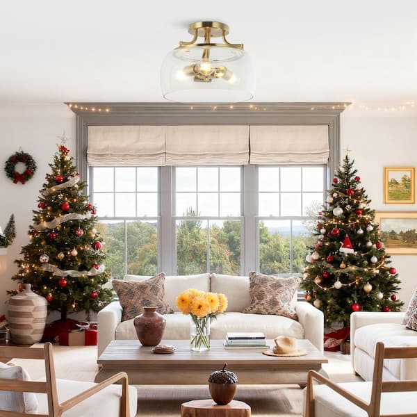 13 in. 3-Light Brass Gold Semi-Flush Mount Ceiling Light Fixture with Clear Glass Shade