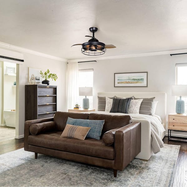 36 in. Industrial Retractable 3-Blade Black Ceiling Fan with Light Kit and Remote Control