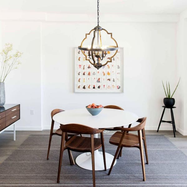 4-Light Distressed Black Farmhouse Globe Cage Candlestick Island Chandelier with Faux Wood Metal Frame