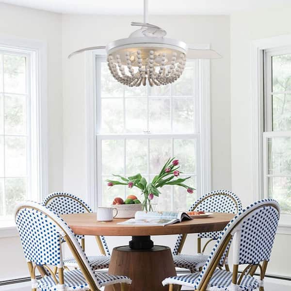 Huang 42 in. Indoor Wooden Beads Retractable 3-Blade White Ceiling Fan Chandelier with Light Kit and Remote Control