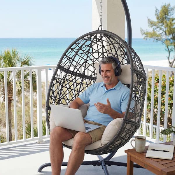 Patio 1-Person Outdoor Beige PE Wicker Porch Swings Hanging Egg Chair with Cushions and Stand
