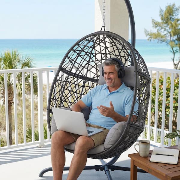 Patio 1-Person Outdoor Light Gray PE Wicker Porch Swings Hanging Egg Chair with Cushions and Stand