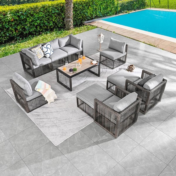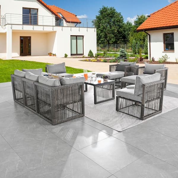 10-Piece Wicker Patio Conversation Deep Seating Set with Gray Cushions