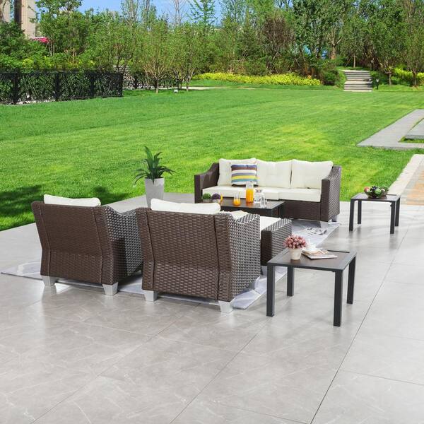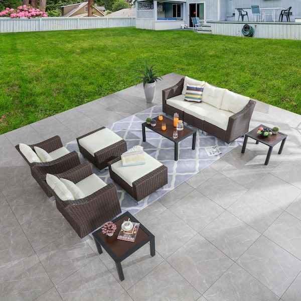 10 Piece Wicker Patio Conversation Set with Beige Cushions