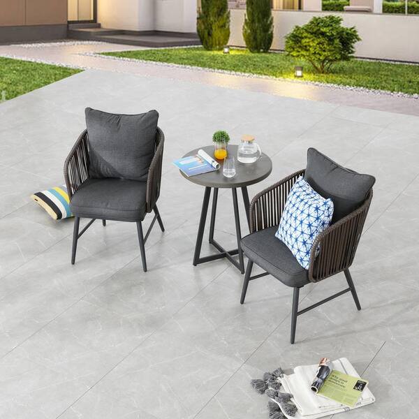 3-Piece Wicker Patio Bistro Set with Grey Cushions