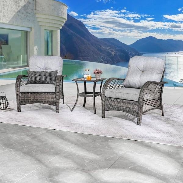 3-Piece Wicker Patio Conversation Set with Gray Cushions