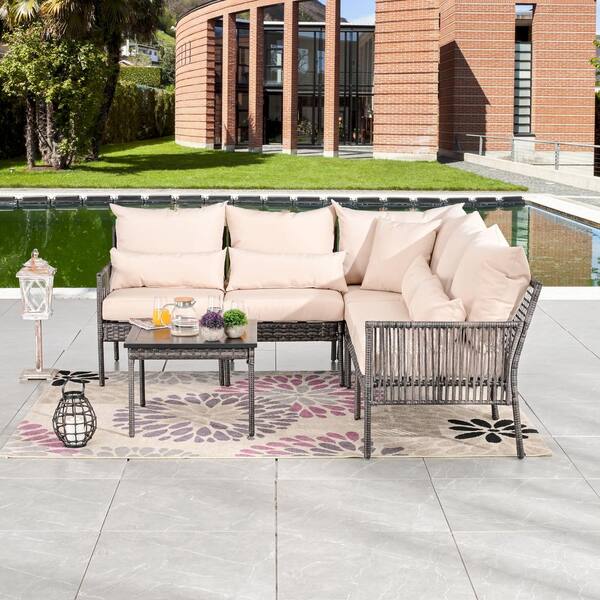6-Piece Wicker Outdoor Conversation Set with Beige Cushions