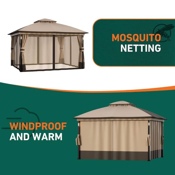 Patio Gazebo 11 ft. x 13 ft. with LED Lights and Bluetooth Speaker, Netting and Curtains, Brown