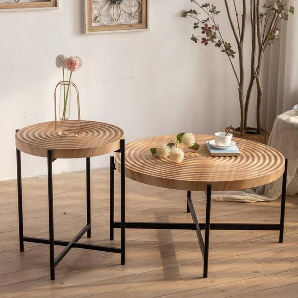 Patio Modern Thread Design Round Coffee Table, MDF Table Top with Cross Legs Metal Base, Set of 2 for Porches, Poolside