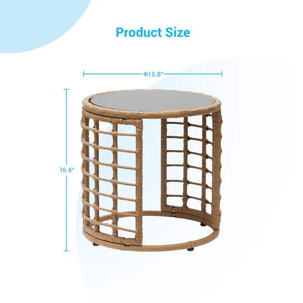 Patio Wicker Side Table, Brown Rattan Round Glass Top Wicker Coffee Table Storage Table