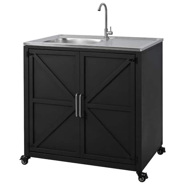 PatioPro 35 in. Matte Black Steel Built-In Outdoor Sink Station with Cabinet, Faucet and Drain Assembly