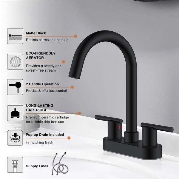 4 in. Centerset Double Handle Bathroom Faucet with Pop Up Drain and Water Supply Lines in Matte Black