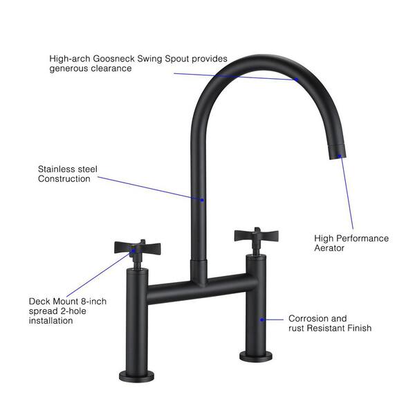 Double Handle Bridge Kitchen Faucet with 360° Spout Swivel in Matte Black in Stainless Steel