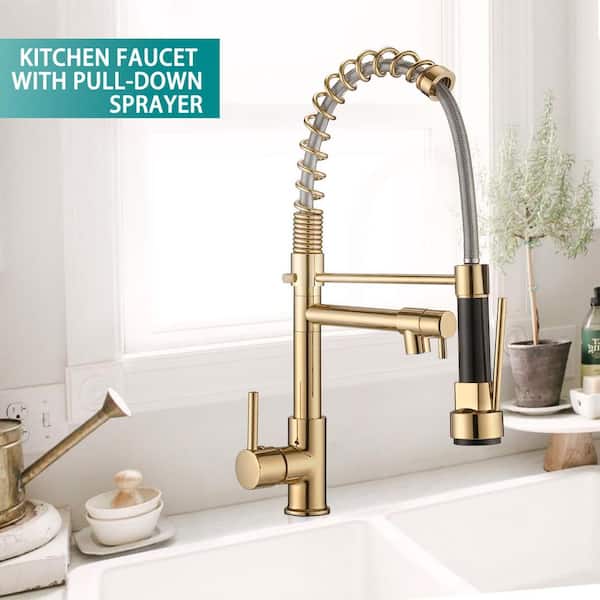 Single Handle in Gold 18.8 in. H Pull Down Sprayer Kitchen Faucet with 360° Spout Swivel Type