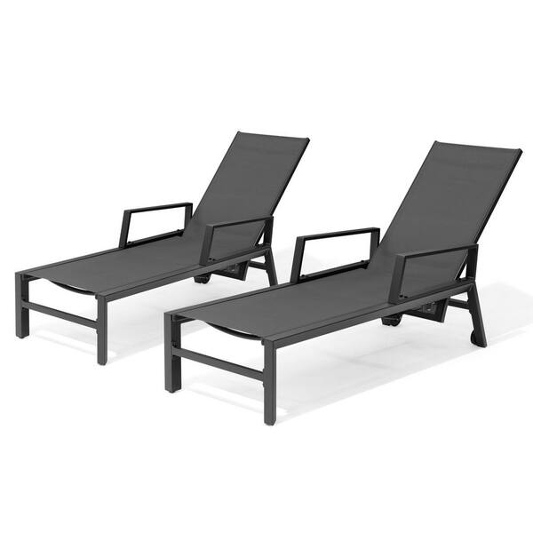 2-Piece Metal Aluminum Outdoor Chaise Lounge Chairs in Black with Adjustable Backrest, Arms and Wheels