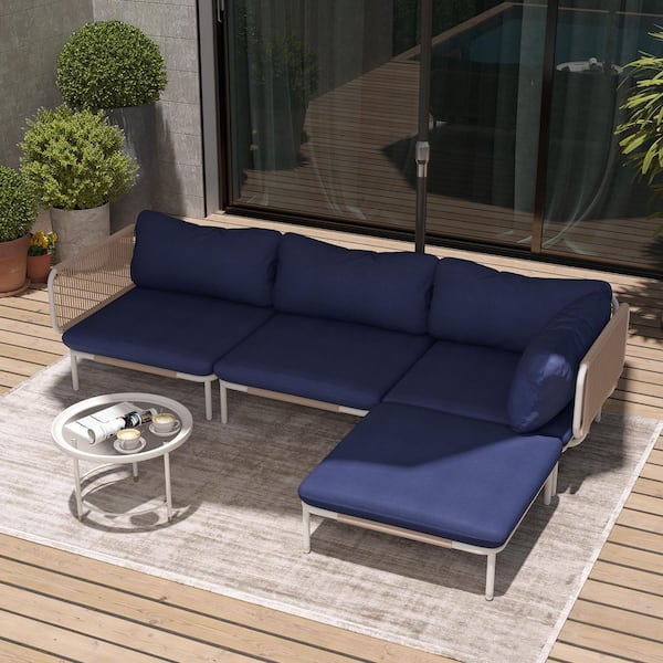 4 Piece Metal Outdoor Sectional Sofa with Navy Blue Cushions 8-Armrest