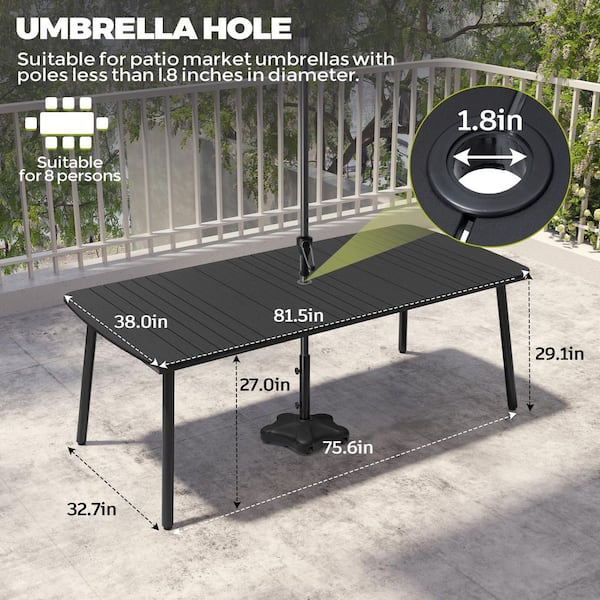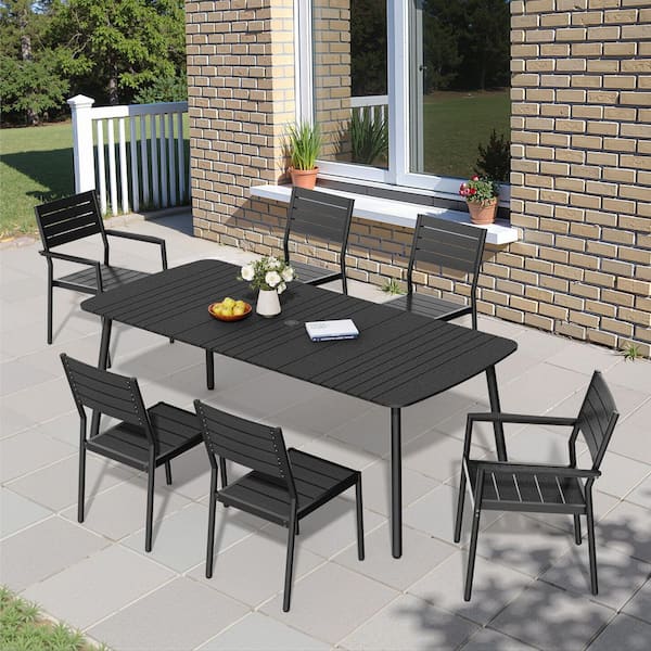 7-Piece 81.5 in. Black Aluminum Patio Outdoor Dining Set, Rectangle Table with Umbrella Hole and Stacking Chairs