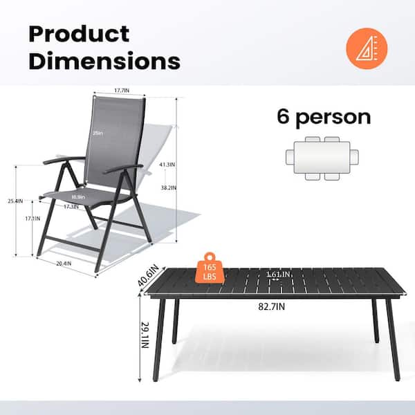 7-Piece 83 in. Black Rectangular Aluminum Wood-Like Outdoor Patio Dining Set, Gray Adjustable Backrest Metal Chair