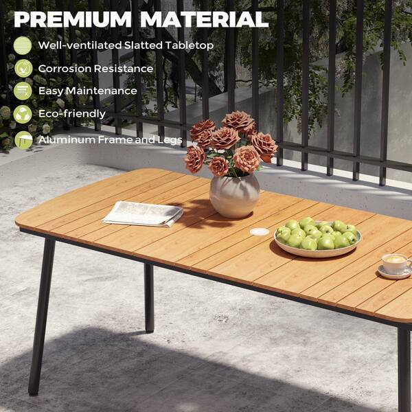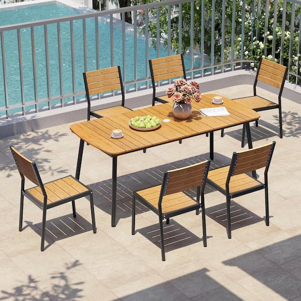 7-Piece Aluminum Patio Outdoor Dining Set Slat Rectangle Table with Umbrella Hole and Stacking Dining Chairs, Brown