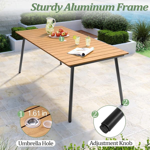 7-Piece Brown 70 in. Aluminium Wood-Like Rectangle Outdoor Dining Set with Umbrella Hole and Foldable Recliner Chairs
