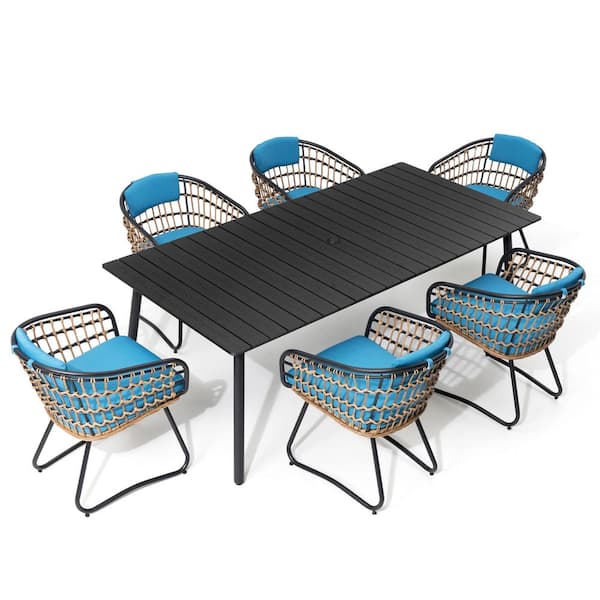 7 of Piece Aluminum Rectangle Table Wicker Chairs Outdoor Dining Set with Blue Cushion