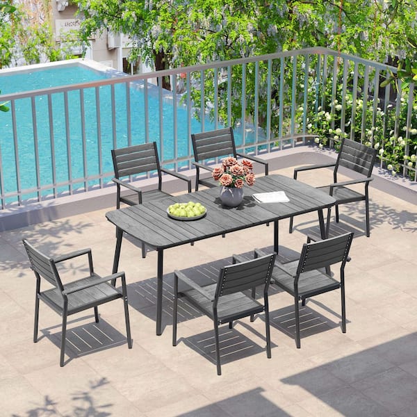 70.9 in. Rectangular Round Corner Aluminum Outdoor Patio Dining Table with Wood-Like Tabletop in Gray