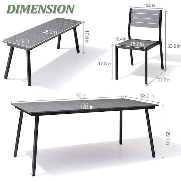 70 in. Gray Aluminum Wood-Like Outdoor Dining Set with Umbrella Hole and 2 Bench 2 Stackable Armless Chairs (5 Pieces)