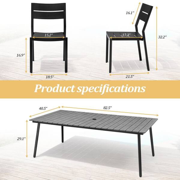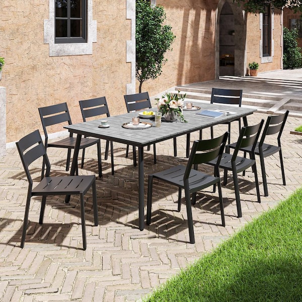 82.5 in. Gray Aluminum Wood-Like Outdoor Dining Set with Umbrella Hole and Black Stackable Armless chairs (9 Pieces)
