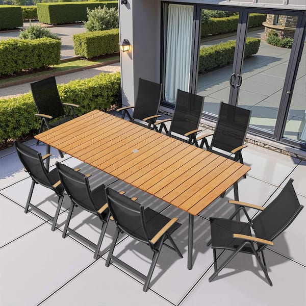 9-Piece Brown 94.5 in. Aluminium Wood-Like Rectangle Outdoor Dining Set with Umbrella Hole and Foldable Recliner Chairs