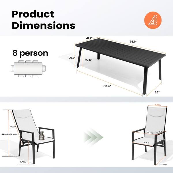 9-Pieces 94 in. High-end Black Rectangle Metal Aluminum Patio Outdoor Dining Set with Adjustable Backrest Gray Chair