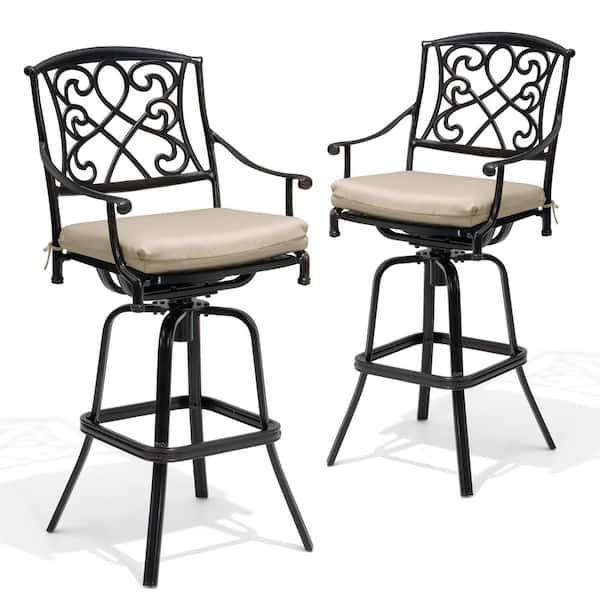 Bar Height Arm Chair Swivel Cast Aluminum Outdoor Bar Stool with Sunbrella Canvas Antique Beige Cushion (2-Pack)