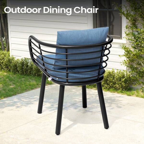 Black 7-Piece 71 in. Aluminum Wood-Like Patio Outdoor Dining Set with Sunbrella Blue Cushion Chair, Umbrella Hole Table