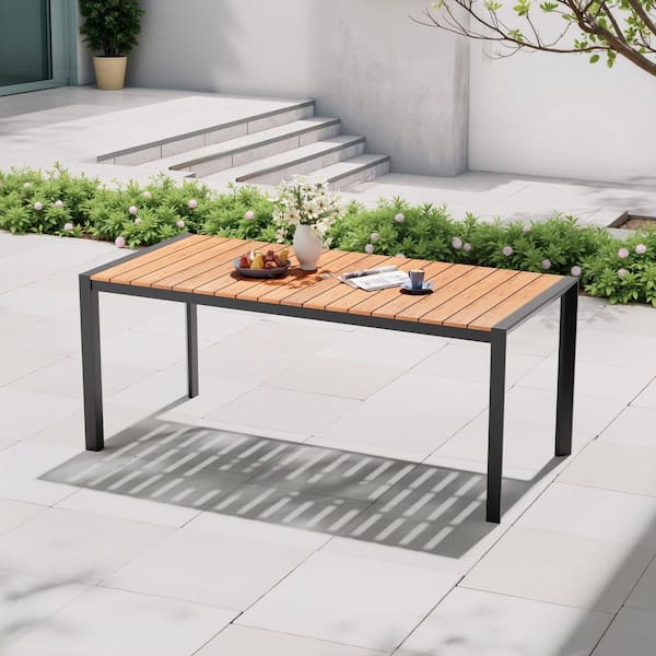 Brown 71 in. Rectangular Aluminum Patio Outdoor Dining Table with Wood-Like Tabletop and Umbrella Hole