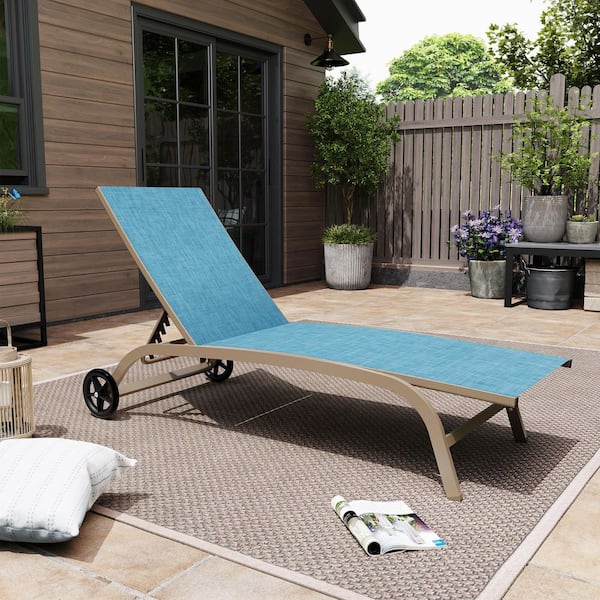 Full Flat 1-Piece Aluminum Adjustable Outdoor Chaise Lounge in Blue with Wheels