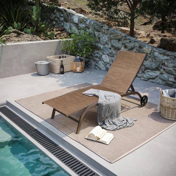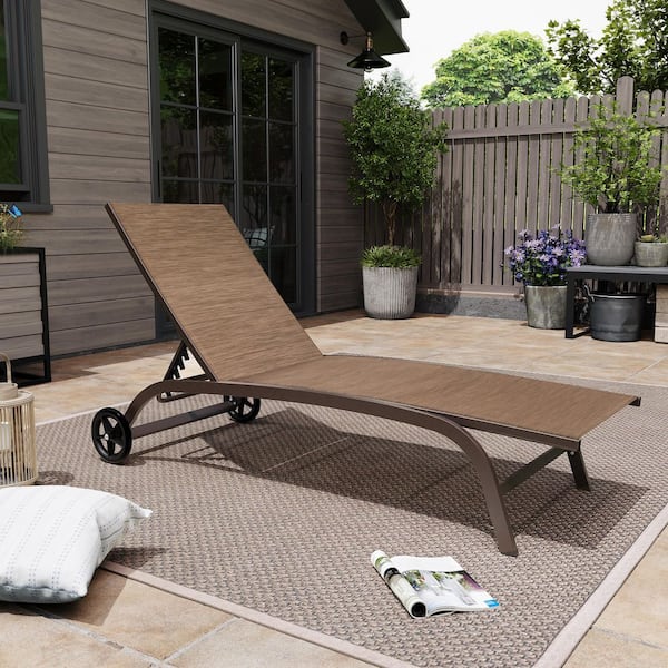 Full Flat 1-Piece Aluminum Adjustable Outdoor Chaise Lounge in Brown with Wheels