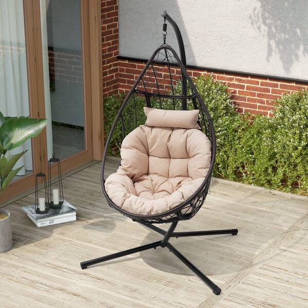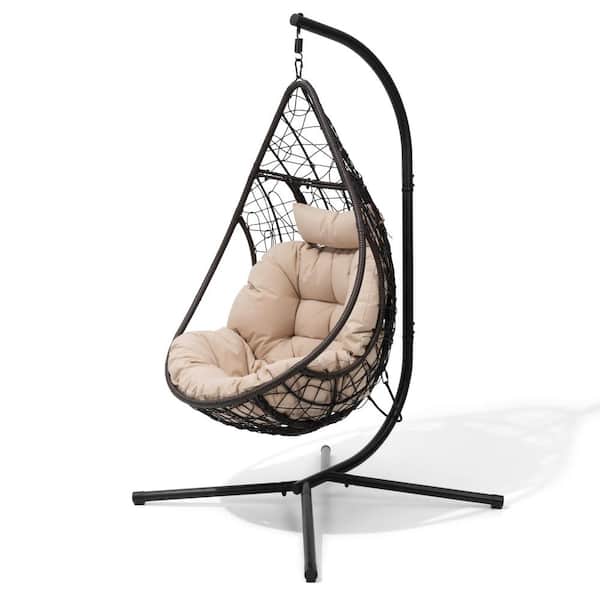 Metal Frame PE Rattan Egg Chair Porch Swing with Beige Cushion